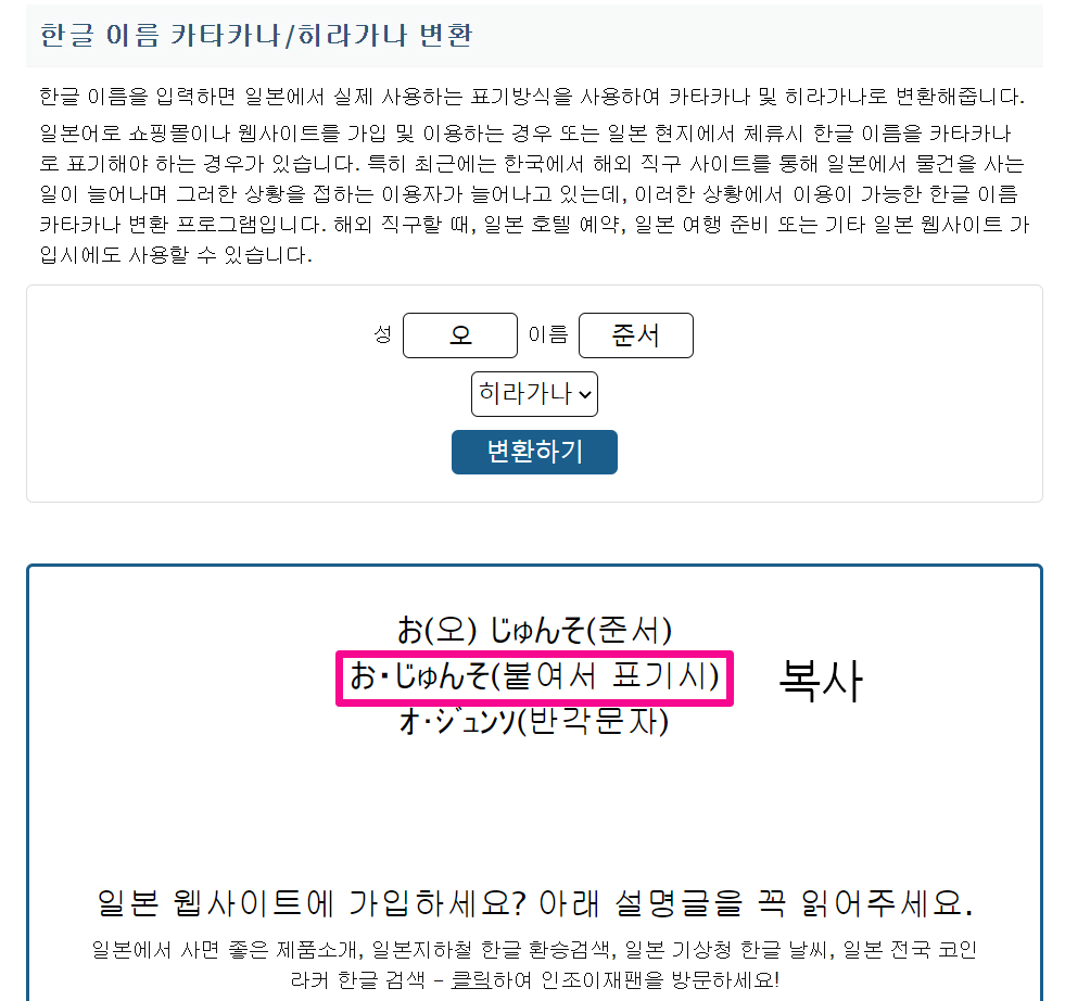 한국 이름을 일본 이름으로, 또 가나로 변환해줍니다.