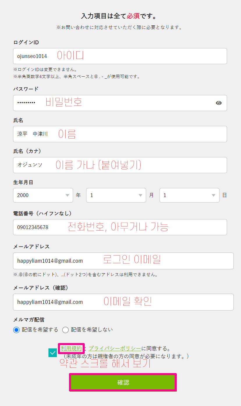 먼저 이메일을 작성하고 초록색 글씨를 클릭하여 회원 약관을 끝까지 읽어줍시다. 다시 핑크색 박스 클릭