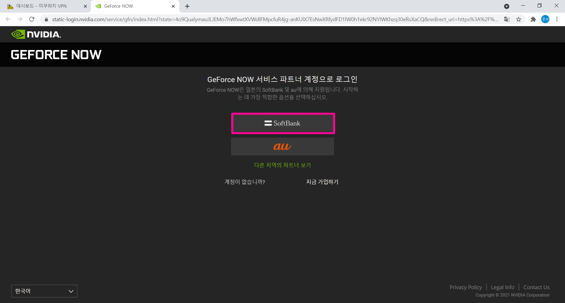 VPN을 켜시고 지포스 나우에 들어가시고 로그인 클릭