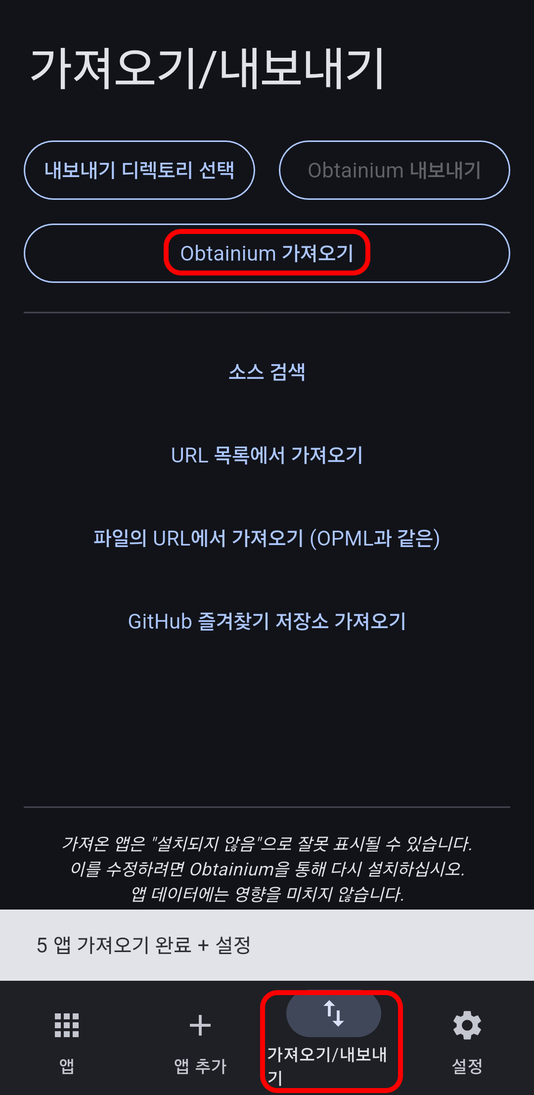 앱 실행 이후 "가져오기" - "Obtainium 가져오기"를 클릭해 주세요