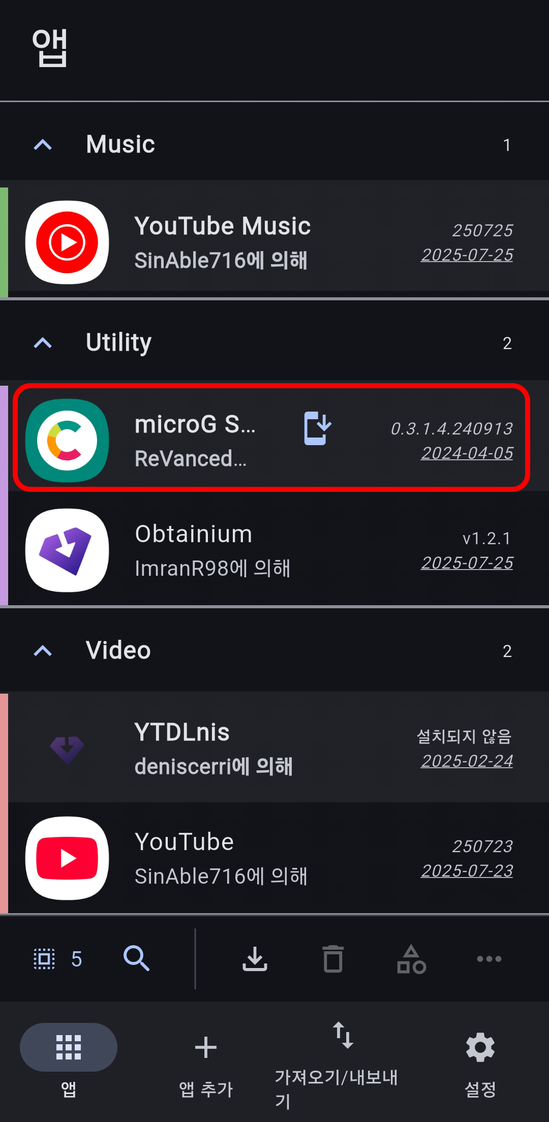 그러면 오른쪽과 같이 바뀌게 됩니다. 5개의 앱들이 뜨는데 유튜브, 유튜브 뮤직(선택), MicroG(필수) 등이 있습니다.